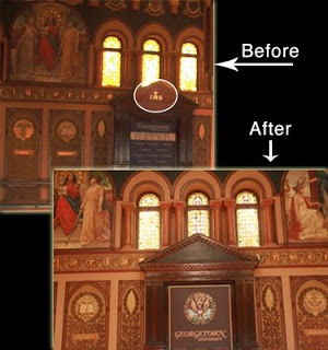 Through these Bishops, Marxist-infected Catholic "values" have become pervasive throughout America. It was evidenced by the formerly Catholic Georgetown University's behavior toward their hero, the moral monster Comrade Obama (peace be upon him) when they decided to honor him there. Super-sensitive to his hatred of Christianity in general and Jesus Christ in particular, they covered up the IHS Christogram representing the name of Jesus, so that Comrade Obama (peace be upon him) would not be offended.