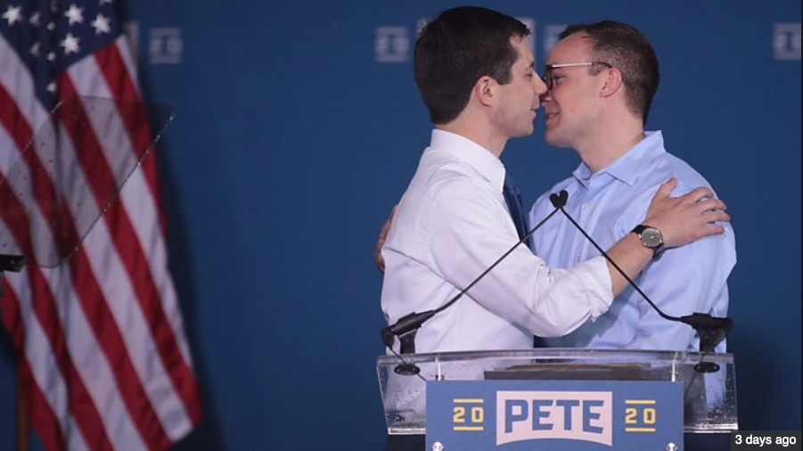 Marxocrat Party Presidential Candidate Pete Buttigieg (on left) kissing her husband. Candidate Pete quite often kisses her husband in public, and just as often, she bitterly complains, from the campaign stage, about the serious and growing problem of how, all across America, millions of parents are now struggling with the super-difficult problem of just exactly how to explain President Trump to their children.The "Wokes" are activist about it; they proactively work to impose their beliefs on the whole culture, against its will.