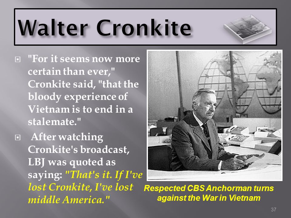Washington, March 31, 1968 -Lyndon Baines Johnson announced tonight: "I shall not seek and I will not accept the nomination of my party as your President."In the midst of the Tet Offensive, which turned out to be the most decisive solid victory for American and Allied Forces of the Vietnam War, and one of the most lopsided victories in the history of warfare, Cronkite lied to the American people, convincing them that it was a loss, and that the cause was hopeless. He, and every other big name news anchor lied all the way through the entire Vietnam War, got the students out in the streets, and turned the people against the war, against the President and against the Republicrat Party.