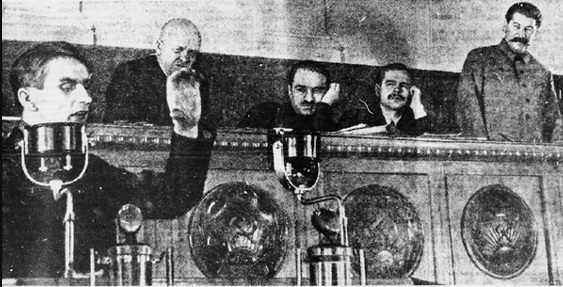 Lysenko addressing the Kremlin in 1935. Behind him ae Stanisalv Kosior, Anastas Mikoyan, Andrei Andreyev and Joseph Stalin, who was the first to stand and applaud Lysenko.