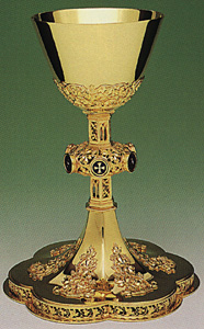 The Chalice holds the wine consecrated at Mass. During the Roman Empire, the Chalice was the “cup of the household” and was often made of precious metal with inlaid gemstones.