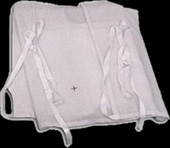 A hood or hood-like cloth. A rectangular piece of linen with an embroidered cross , wrapped around neck, shoulders and breast. It is representative of the garment of the fool that the Roman soldiers placed over our Lord’s head as they blindfolded, mocked and struck Him. Formerly used as a head covering to protect consecrated and priests from the elements, it represents the helmet of salvation. The amice must be of linen or hempen material, not wool. The priest kisses the small cross and touches it to his head before placing it over his neck and shoulders.