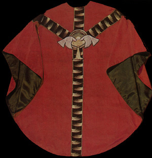 “Chasuble” is derived from the Latin “casula” or “little house” because it was used at times as a literal shelter by clergy. Which tells us how stiff and heavy it used to be. Unlike modern chasubles, traditional (vestment) chasubles are required to have a large cross on the back to signify the yoke of service to our Lord. In times past it was very large, very heavy, and very ornamented, which is why you see altar boys helping the priest to support it during Mass.