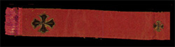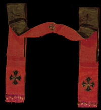 In antiquity, maniples were often worn by Roman magistrates at the start of public events. It is a long cloth draped over the left forearm similar to a waiter’s napkin and pinned in place. Also called the “sudarium” or “sweat cloth” because it was originally used to wipe perspiration. It is the same width as the stole.