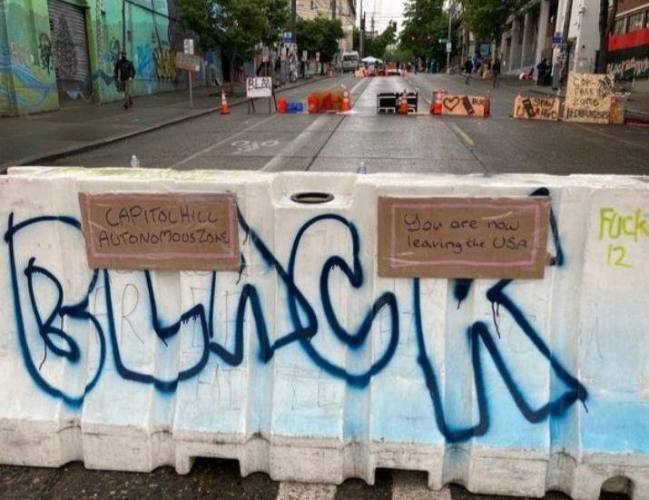 These are the same stupidassed nincompoops who were "demonstrating" against Trump's border wall, and now, they've built their own CHAZ border wall, to keep the rest of America out. Perhaps we should take them at their word, and strengthen that wall to the hilt and build it up, with no gates. Anyone who climbs over or tunnels under should be arrested as illegal alien invaders, banished, with citizenship and all American documents licenses and passports revoked, and deported right back into the self-declared enemy nation of CHAZ.