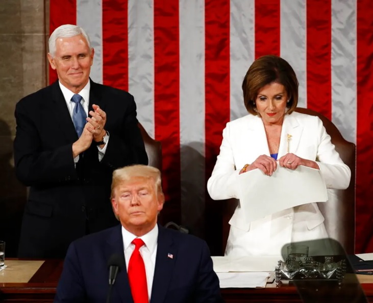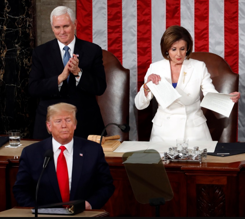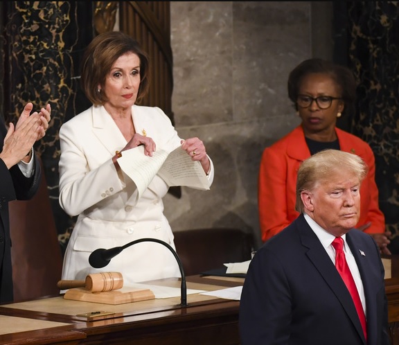 Hate-filled drama-queen Nancy Pelosi, dramatically disrespecting her President, her own chamber, her Constitution and her nation, on camera, to show her deep, visceral loathing of her President, his party and of all of his voters.