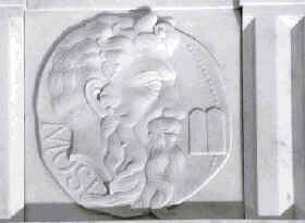 They are depicted most often as two stone tablets inscribed with the Roman numerals I through X; occasionally as one tablet numbered I through X; sometimes with the inscription LEX. This is representative of the Book of the Law. Historical figures are shown holding one or another form of the Book of the Law, sometimes in the form of a book, sometimes a tablet, sometimes reading or holding a scroll and sometimes – most significantly – holding five (5) scrolls, representing the Torah, the first five books of the Old Testament. This is, definitively, The Law.